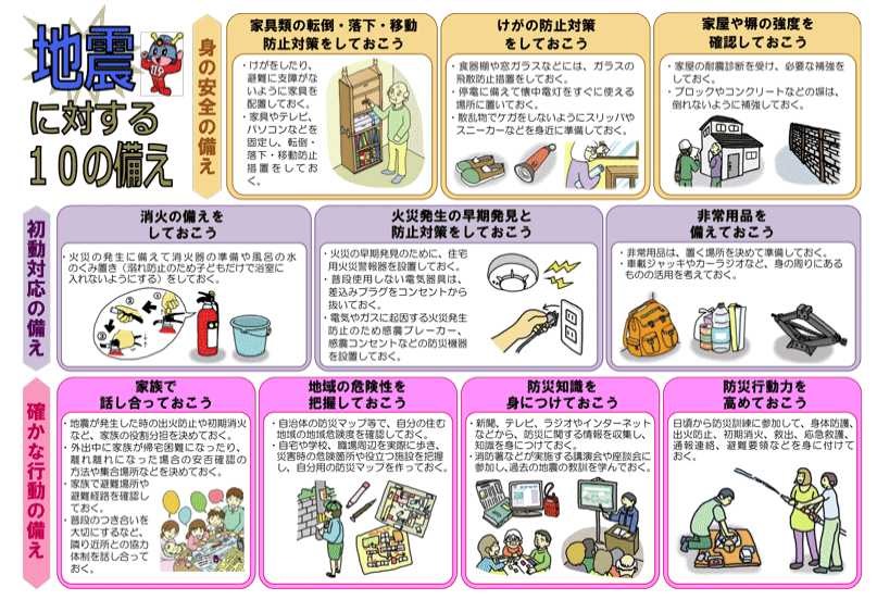 東京消防庁では、万が一の地震に備えて「地震に対する10の備え」を発表しています。